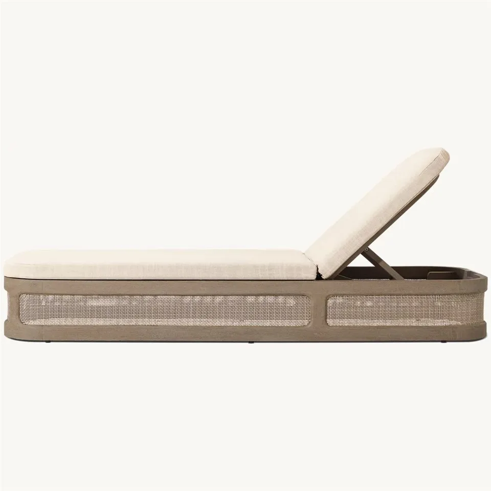 Плетената мрежа около шезлонга добавя текстура, което го прави визуално вече не монотонен и скучен, а простотата разкрива изящност. Това тъкане е не само красиво, но също така увеличава дишането и комфорта на шезлонга, така че винаги да се чувствате прохладни и спокойни, когато го използвате.
