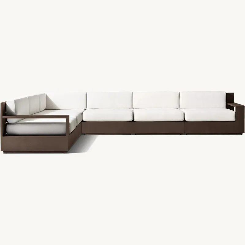 Този диван разполага с модулен дизайн, който може да се конфигурира, за да пасне на всяка външна обстановка, което го прави универсален избор за всяко оформление на задния двор. Секционният диван в задния двор е оборудван с плюшени, устойчиви на атмосферни условия възглавници, които осигуряват превъзходен комфорт и опора, идеални за часове на почивка или общуване. Елегантният, минималистичен стил на алуминиевата рамка се допълва от меката тапицерия, която се предлага в различни цветове, за да пасне на всеки декор.