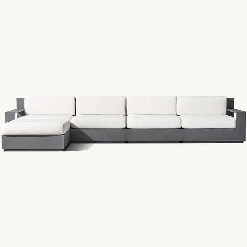 Тази секция съчетава дълбоки, плюшени места за сядане с минималистичен дизайн на рамката, за да предложи визуално привлекателна и невероятно удобна опция за сядане на открито. Тъмносивата тапицерия е изработена от висококачествена, устойчива на атмосферни влияния материя, която издържа на сезонни промени, като същевременно запазва елегантния си вид. Всяка възглавница е пълна с плътна пяна, която поддържа и успокоява, идеална за часове на излежаване или социални събирания.